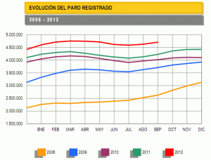 Siguiendo con el dato del desempleo, septiembre fue el segundo mes seguido de subida del paro, lo positivo es que este aumento fue menor al de septiembre de 2011, que fue de una suba de 95.817 parados, y también fue inferior al de 2009, la subida fue de 80.367 parados. Si se ve los datos interanual, entre septiembre de 2011 y septiembre de 2012, de esta manera la tasa de paro subió en 478.535 personas, un 11,32%.